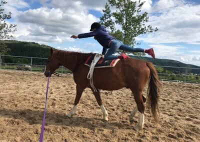 – Pokročilí jezdci jezdí samostatně, podle pokročilosti se věnují jízdárenským cvikům, základům skákání, přirozené komunikaci a podobně.