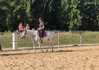 Jezdecký výcvik bude na našich školních koních, které dovezeme z Řícmanic, několik koní bude půjčených, se kterými ale máme mnohaleté zkušenosti. Děti jsou rozdělení do 3 skupin, podle jezdecké pokročilosti. Každé dítě má přiděleného koně, případně i vodiče, který koně vede a pomáhá s přípravou. Začátečníci se nejdříve naučí, jak si koně připravit (čištění, sedlání), potom se na lonži seznámí se základními chody koně, osvojí si správný sed a naučí se koně ovládat. Kromě klasického jízdárenského výcviku a výcviku na lonži budeme využívat krásnou okolní přírodu k vyjížďkám. Zkusíme i jízdu bez sedla, případně nízké skoky, voltiž nebo přirozenou komunikaci ze země. Vše dle domluvy, co budou děti preferovat. Výcvik vede kvalifikovaný instruktor s licencí cvičitele.